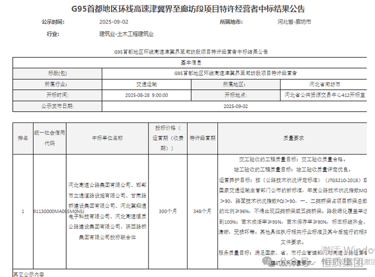 喜訊迎金秋,奮斗結碩果!8月28日,恒質集團成功中標G95首都地區環線高速津冀界至廊坊段項目特許經營者。G95首都地區環線高速津冀界至廊坊段項目估算總投資89.